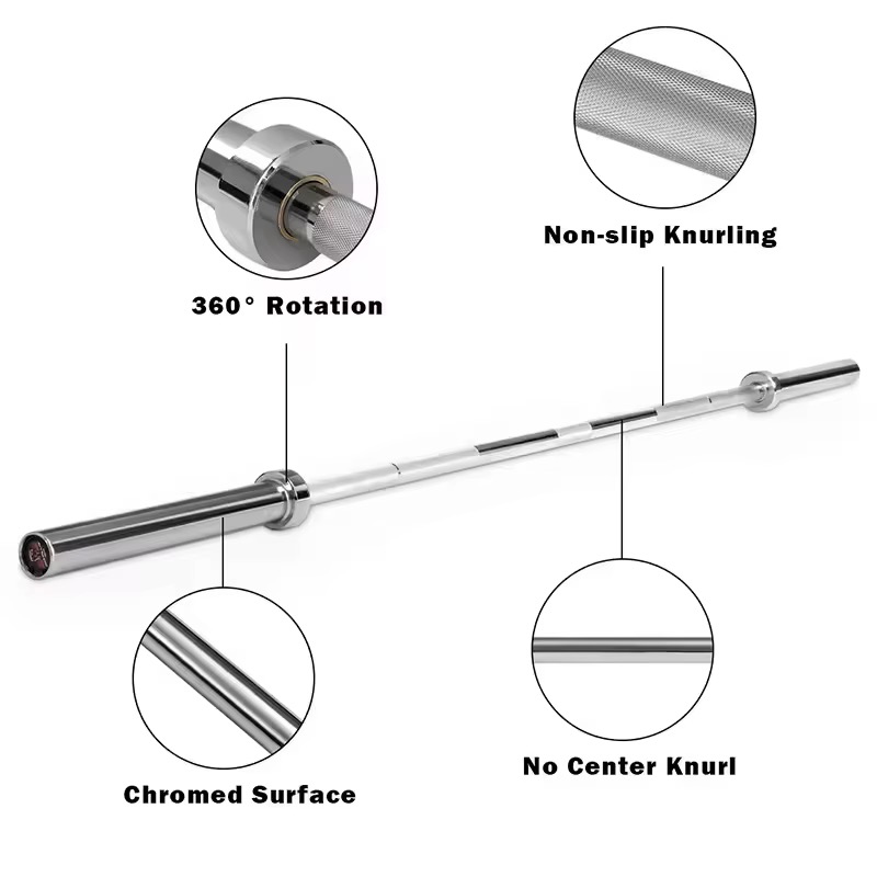 Su diseño de 2.2 metros de largo y 20 kg de peso cumple con el estándar olímpico, lo que la hace compatible con discos de 50 mm.